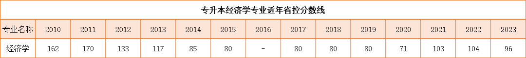 河南专升本 经济学 专业2011年的省控线是比较高的,达到了 170分 ,2023年的省控线是96分。